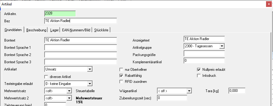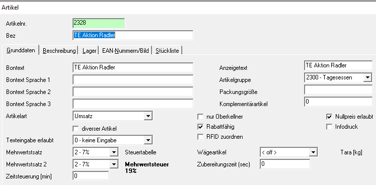3. Prüfen Sie nach Ausführen des Skriptes im Backoffice unter Stammdaten – Artikel stichprobenartig bei einigen Speisen, ob der 1. und der 2. Mehrwertsteuersatz auf 7% stehen.