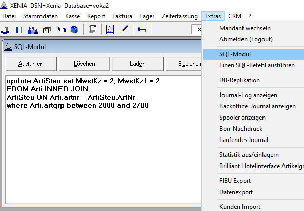 Hier können Sie jetzt das folgende Skript einfügen und ausführen. Bitte ersetzen Sie in diesem Skript in der letzten Zeile die Artikelgruppen-Nummern durch Ihre Artikelgruppen. Es können hier auch einzelne Artikelgruppen umgestellt werden falls diese in Ihrer Datenbank nicht fortlaufend sind. Einfach das Skript aus diesem Schreiben in das Feld SQL Modul im Backoffice